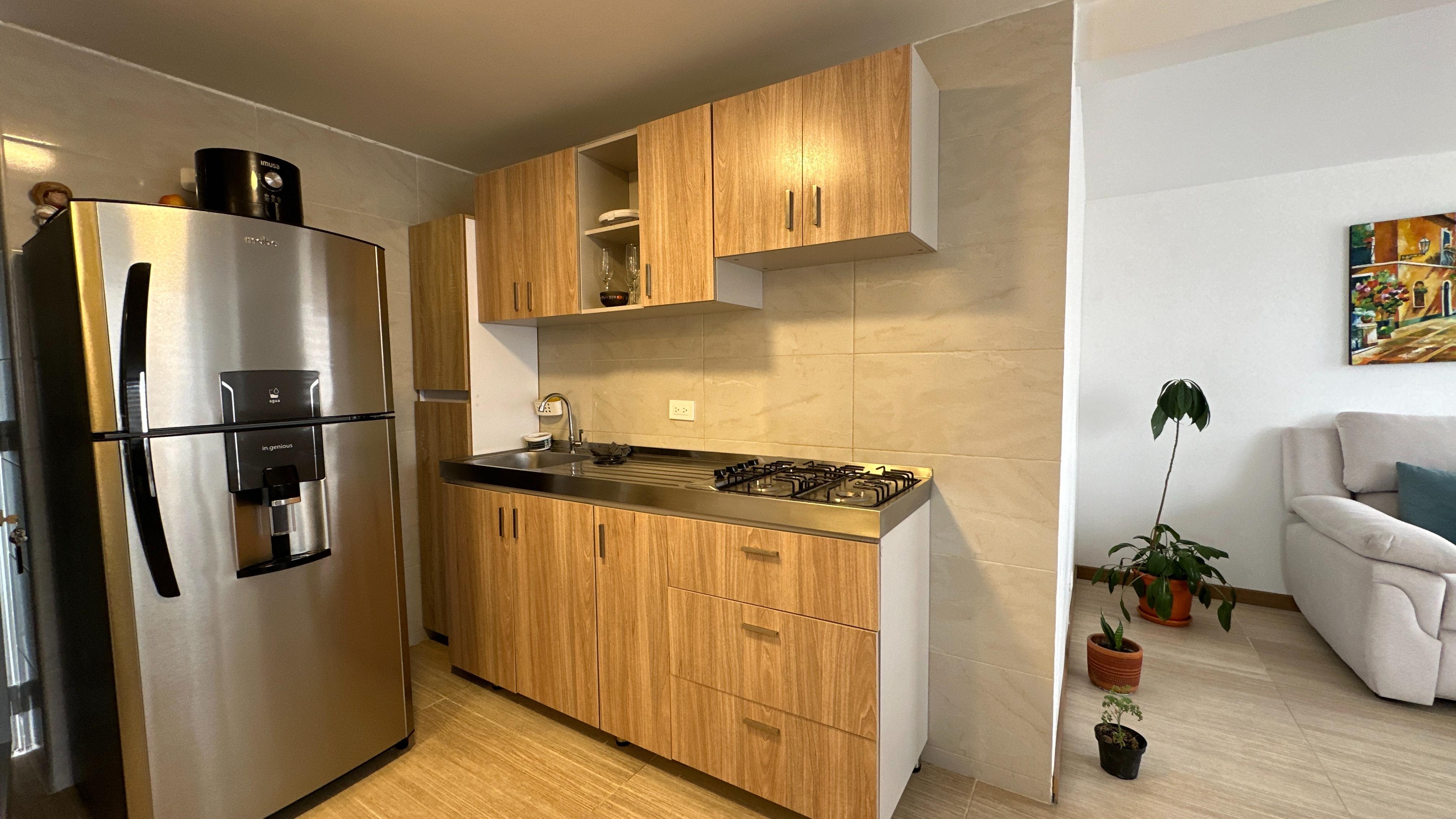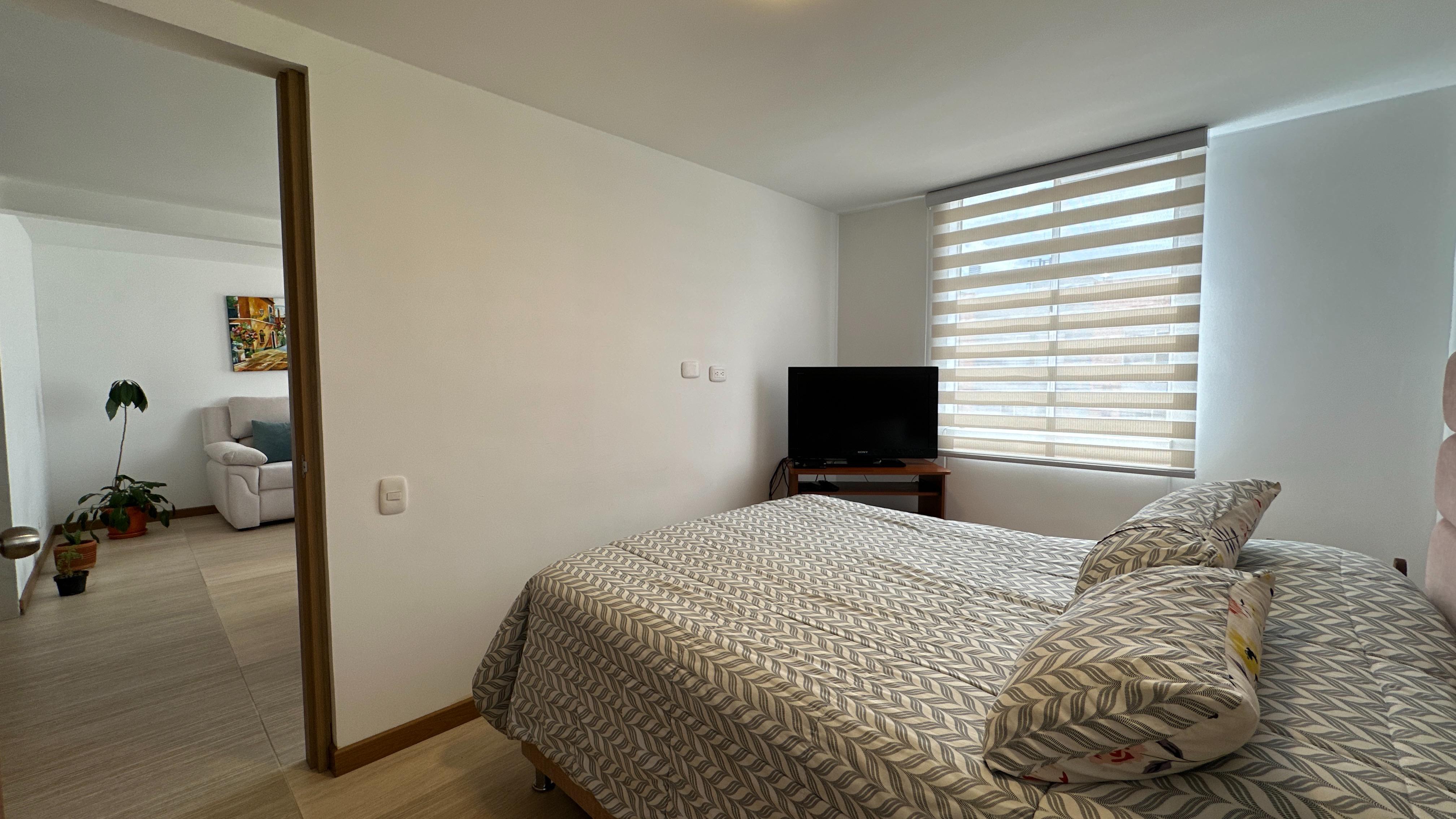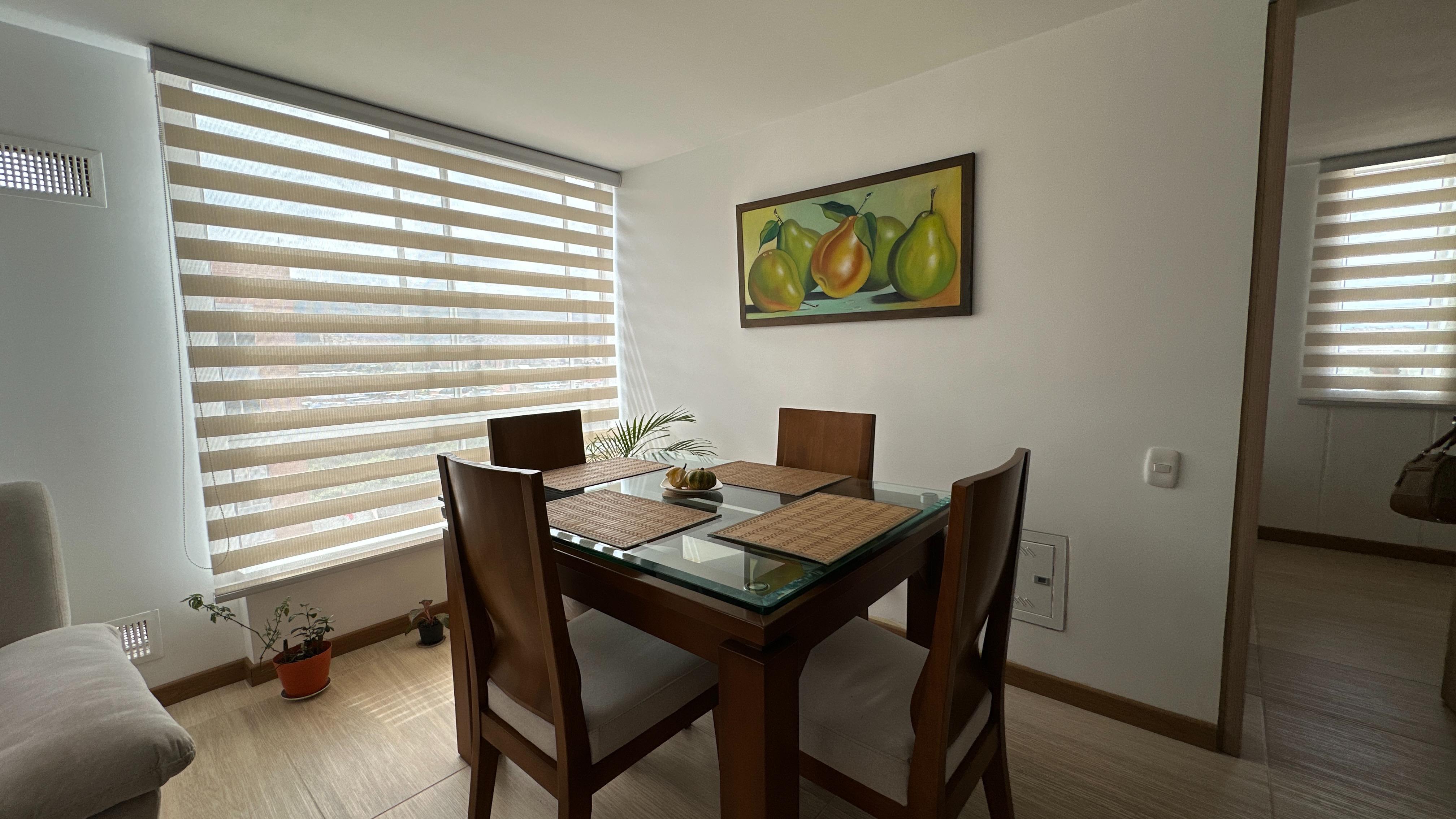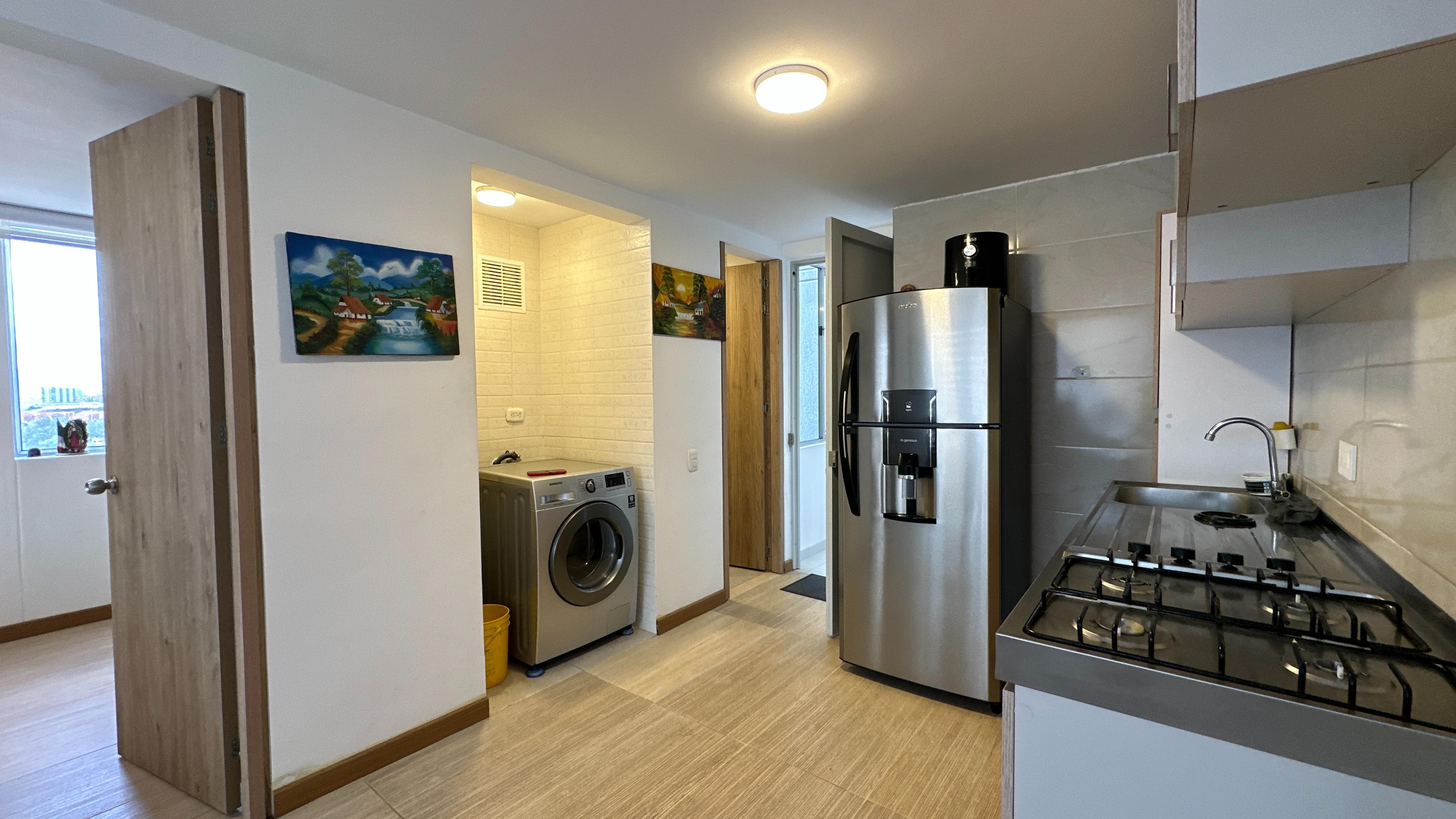 El apartamento se encuentra ubicado en un piso 15, la cual permite muy buena iluminación natural, ventilación y vista agradable. Cuenta con cocina abierta con mesón en acero inoxidable, zona de lavandería, baño social, sala y comedor, una habitación con amplio closet y baño privado con acabados modernos.