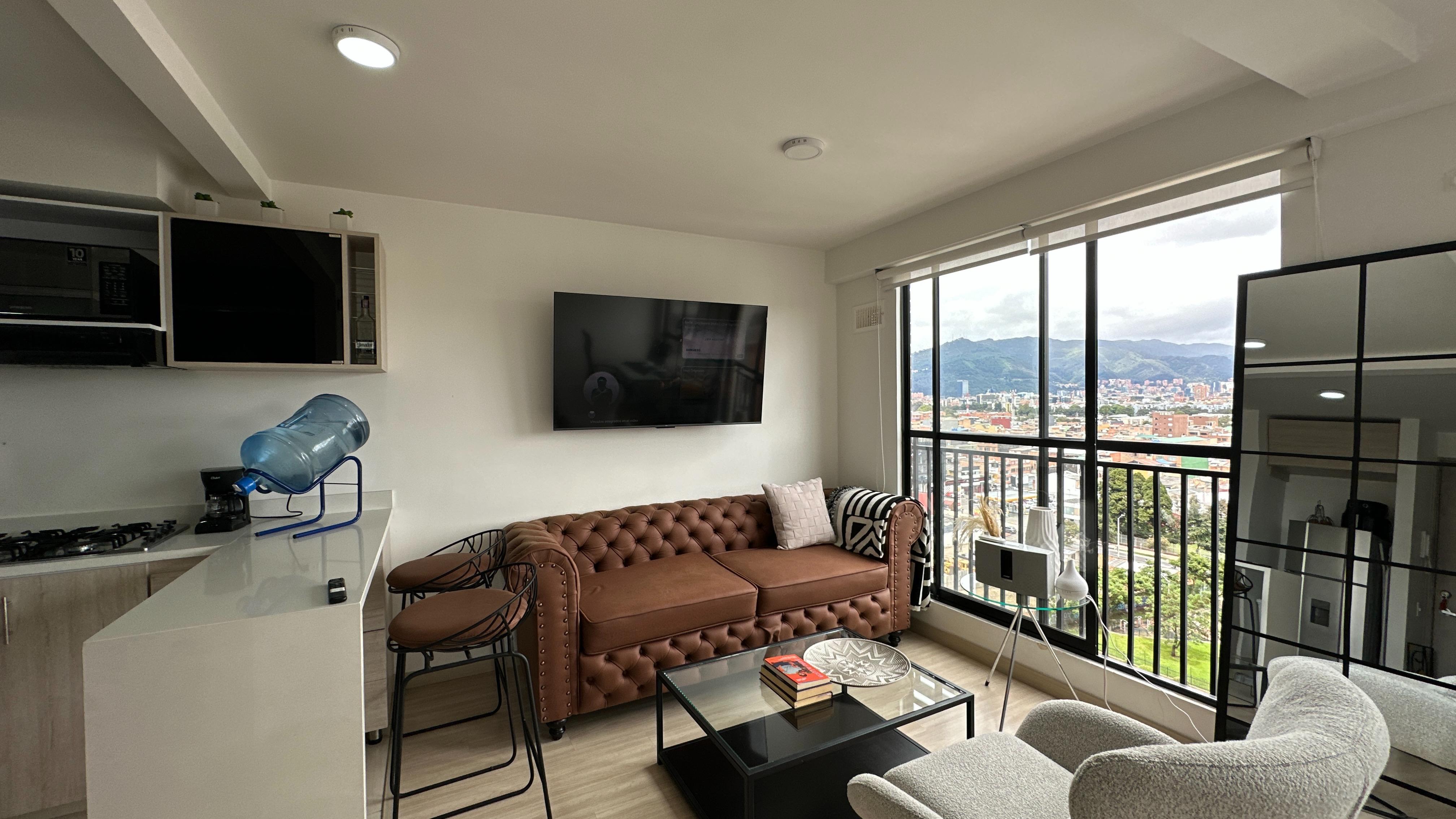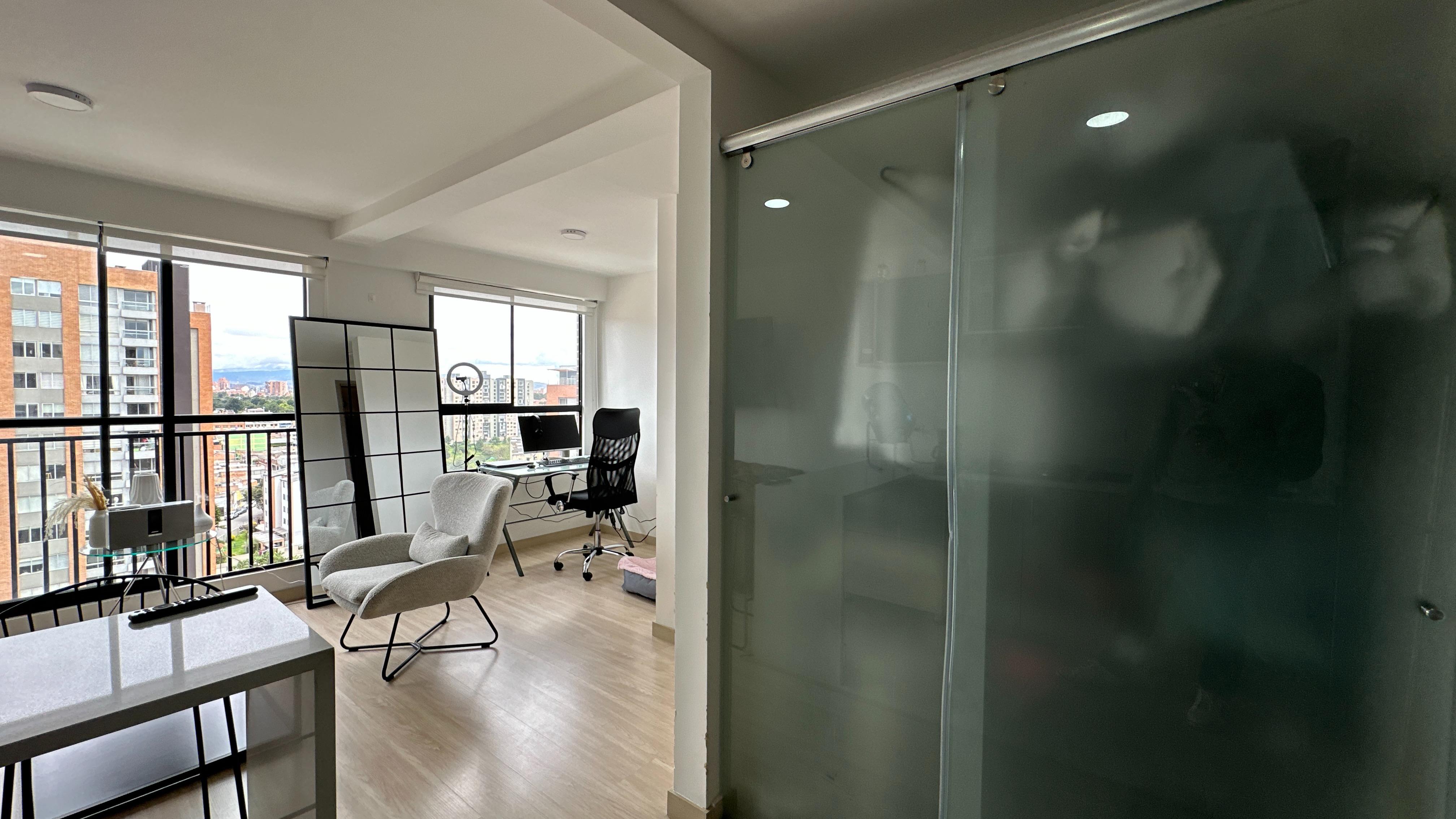 El apartamento cuenta con pisos en madera laminada, cocina abierta con mesón blanco en quarztone, espacio para adecuar como estudio, una habitación con muy buena vista, closet abierto, un baño completo, zona de lavandería independiente, sala con puerta ventana simulación de balcón. Parqueaderos comunales por sorteo cada 4 meses.